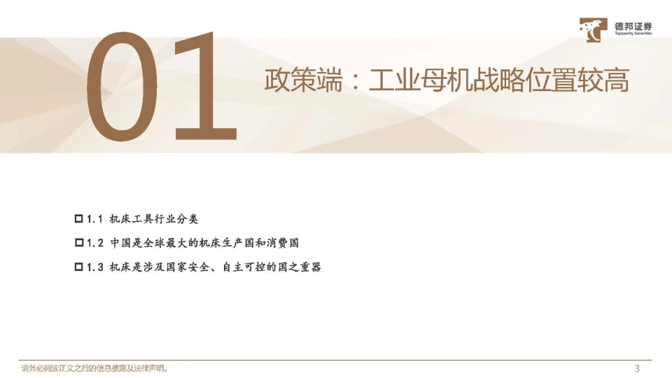 政策端:工業母機戰略位置較高機床工具行業可分為八個細分行業,廣泛用于制造業根據中國機床工具工業協會的統計分類標準,機床分為金屬切削機床、金屬成形機床、鑄造機械、木工機械等4個主 機行業,以及機床附件、工具及量具量儀、磨料磨具和其他金屬加工機械等4個輔機行業或配套部件行業。 機床作為高端裝備制造業的“工業母機”,數控機床產品用途非常廣泛,下游客戶包括傳統機械行業、汽車行業、電 力設備、鐵路機車、船舶、國防工業、航空航天工業、石油化工、工程機械、電子信息技術工業以及其他加工工業。中國是全球最大的機床生產國和機床消費國從世界范圍內來看,中國、美國、德國、日本、意大利是機床生產、消費的主要國家/地區。其中,德國、日本機床行業 憑借較強的技術積累與市場競爭力凈出口規模較大,中國、美國為機床凈進口國家。中國是全球制造業的中心,隨著中國經濟 的快速發展和固定資產投資的增加,中國機床市場發展前景廣闊。機床產業鏈補短板進程有望加快機床上游產業鏈圖譜機床產業鏈上游主要包括數控系統、電氣元件、精密件和功能部件、鑄件及版焊件。機床上游產業鏈對海外廠商依賴 較高,國家推出一系列“強鏈補鏈”政策,加快補短板、強弱項。2023年3月16日,國務院國資委黨委在《人民論壇》發表 署名文章《國企改革三年行動的經驗總結與未來展望》,其中指出將乘勝而上實施新一輪國企改革深化提升行動,更大力 度布局前瞻性戰略性新興產業。加大在集成電路、工業母機等領域加快補短板強弱項。強化在產業鏈循環暢通中的支撐帶 動作用。持續推動基礎固鏈、技術補鏈、優化塑鏈、融合強鏈。圍繞產業鏈部署創新鏈,加快在重要領域和節點實現自主 可控,增強國內大循環內生動力和可靠性。機床核心零部件—數控系統數控系統是數控機床裝備的“大腦”,直接影響數控機床裝備的 功能、性能、和技術水平的高低。 數控系統是數字控制系統的簡稱,根據計算機存儲的控制程序, 執行部分或全部 數值控制功能,并配有接口電路和伺服驅動裝置的專 用計算機系統。通過利用數字、文字和符號組成的數字指令來實現一臺 或多臺機械設備動作控制,它所控制的通常是位置、角度、速度等機械 量和開關量。機床核心零部件—主軸電主軸是數控機床的重要組成部件,具有結構緊湊、重量輕、慣量小、性能良好等特點。電主軸是將主軸和電動機融 合在一起,其優勢在于實現了機床的“零傳動”,提高傳動效率,可實現超高速轉動,